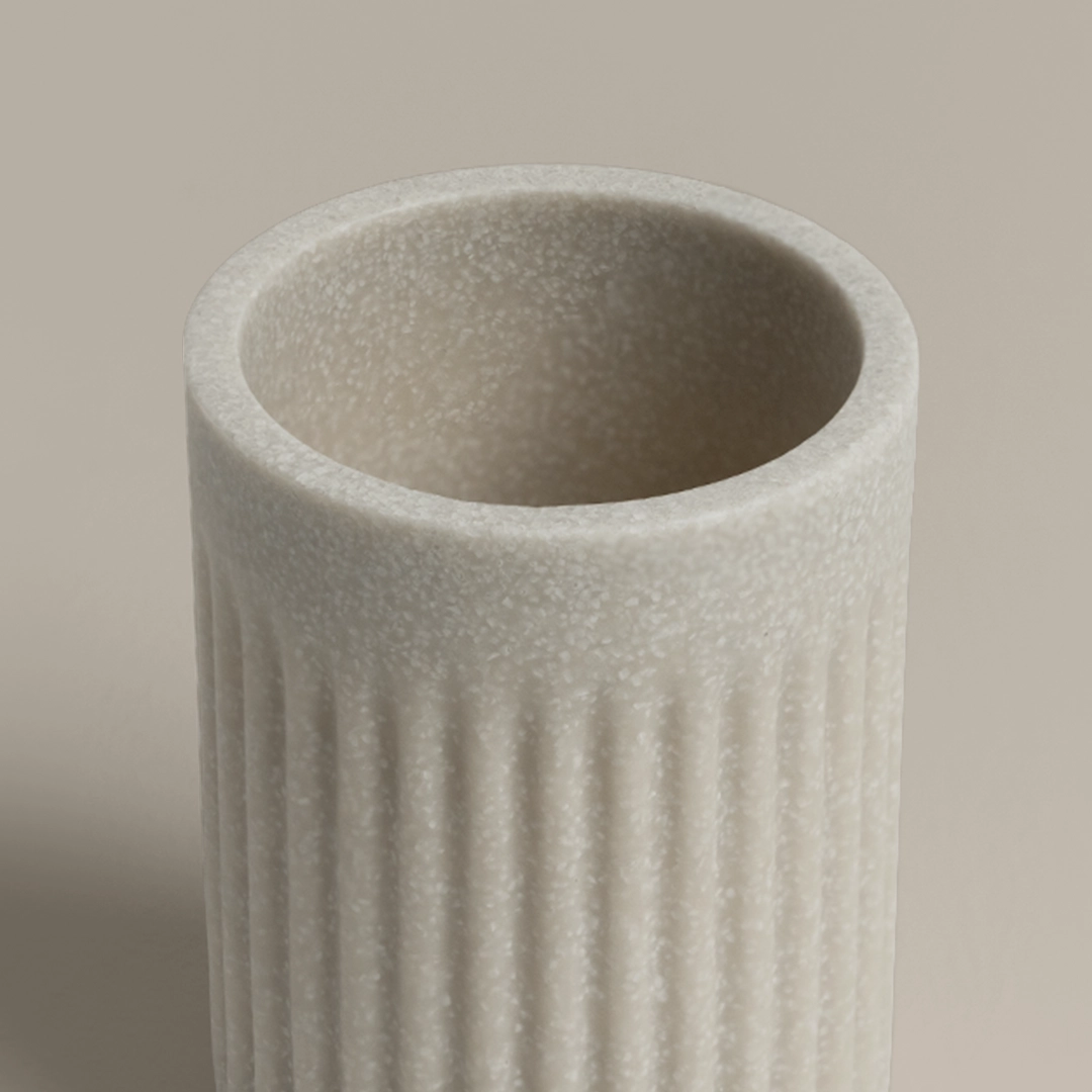 كوب من البوليريسين بلون بيج أنيق وعصري، متين وسهل التنظيف، مثالي لحفظ فرش الأسنان أو الأدوات الصغيرة. من بيتي الصغير.