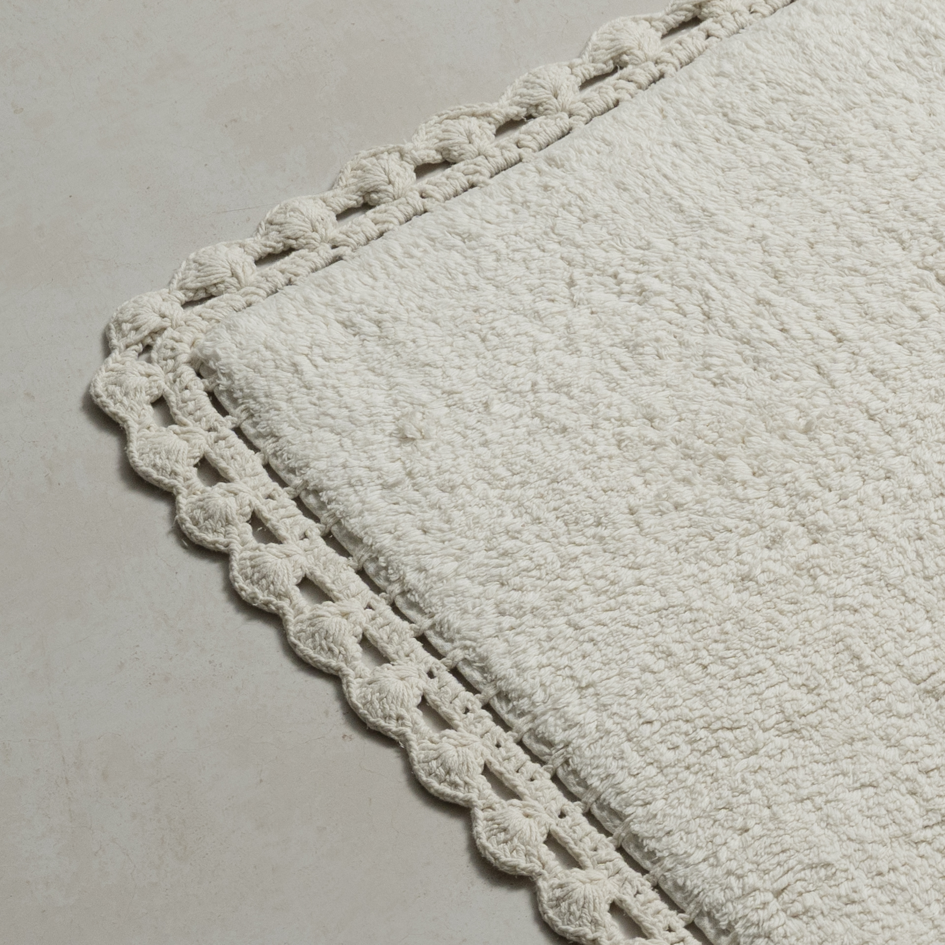 دعّاسة كرسي بلون أوف وايت بأطراف كروشيه، بمقاس عملي 60×50 سم، مصنوعة من خامة ناعمة عالية الامتصاص.