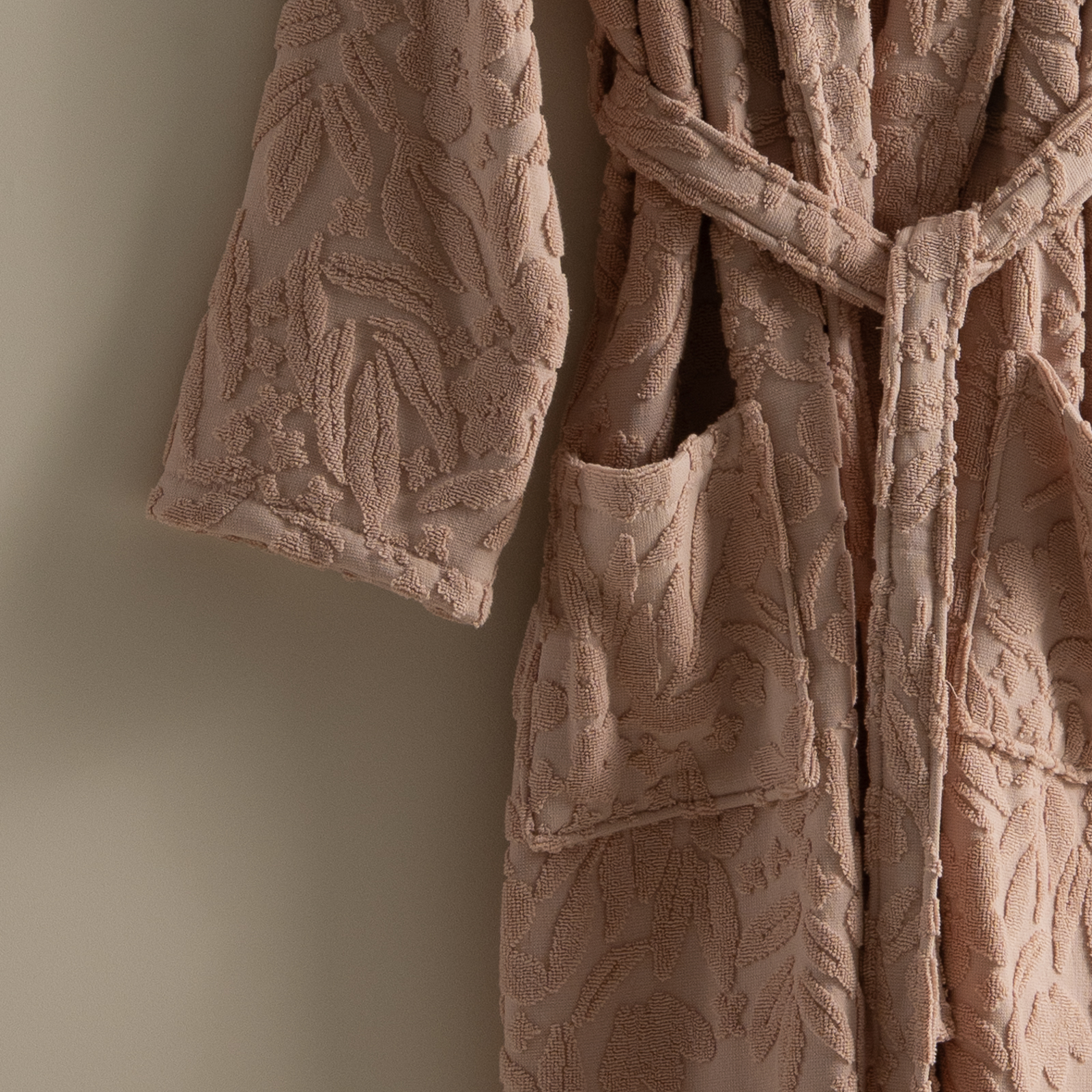 مصنوع من قطن 100% ناعم وعالي الامتصاص، بتصميم لف عملي مع حزام خصر وجيوب جانبية.