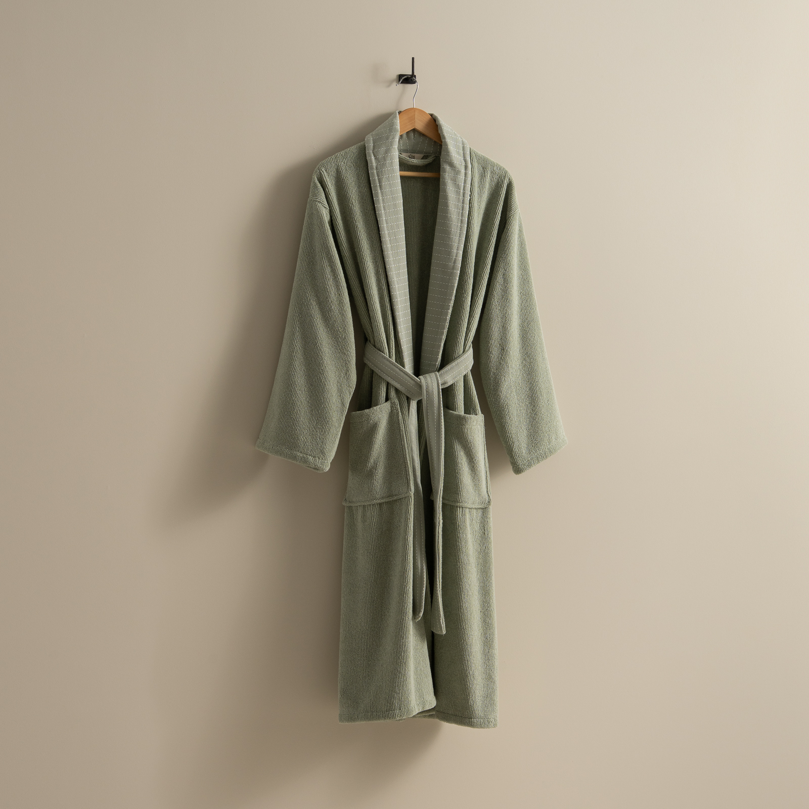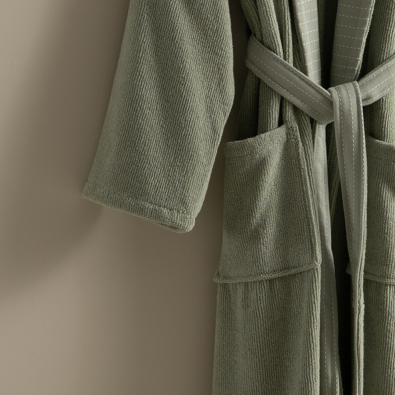 مصنوع من قطن 100% ناعم وعالي الامتصاص، بتصميم لف عملي مع حزام خصر وجيوب جانبية.