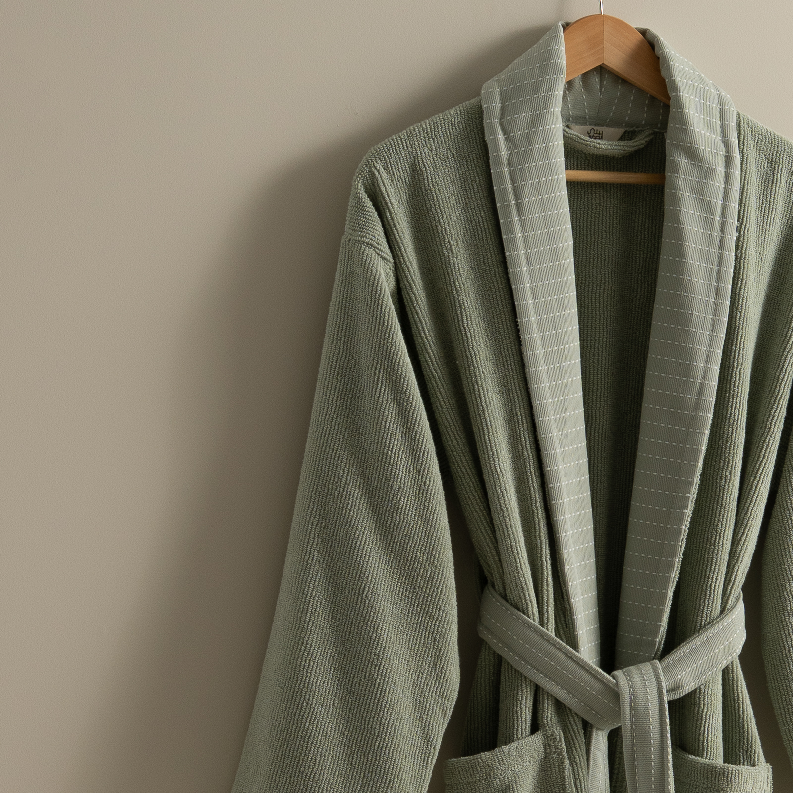 روّب حمام بلون أخضر ناعم، خامته قطن طبيعي، تصميمه عملي وأنيق، سريع امتصاص الماء وسريع الجفاف