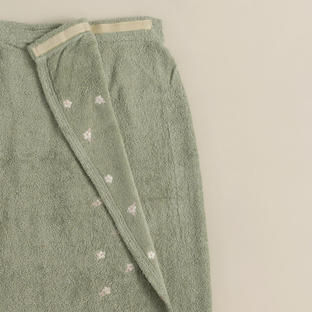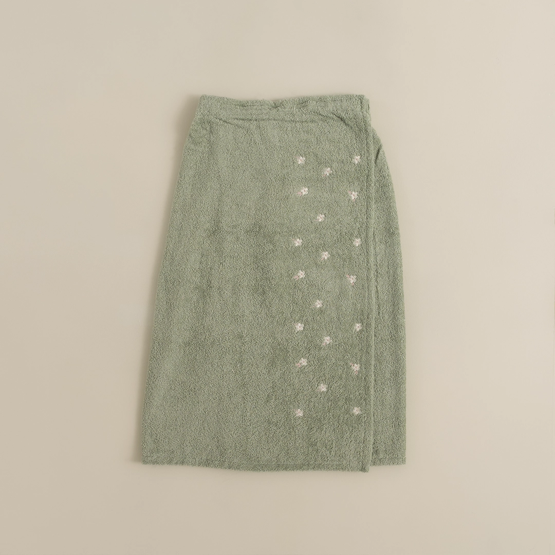 تنورة الحمام القطنية من بيتي الصغير، المصممة بلون أخضر هادئ يعكس الطبيعة والسكينة، وتطريز ناعم بزهور أوف وايت تضيف لمسة أنثوية راقية.
