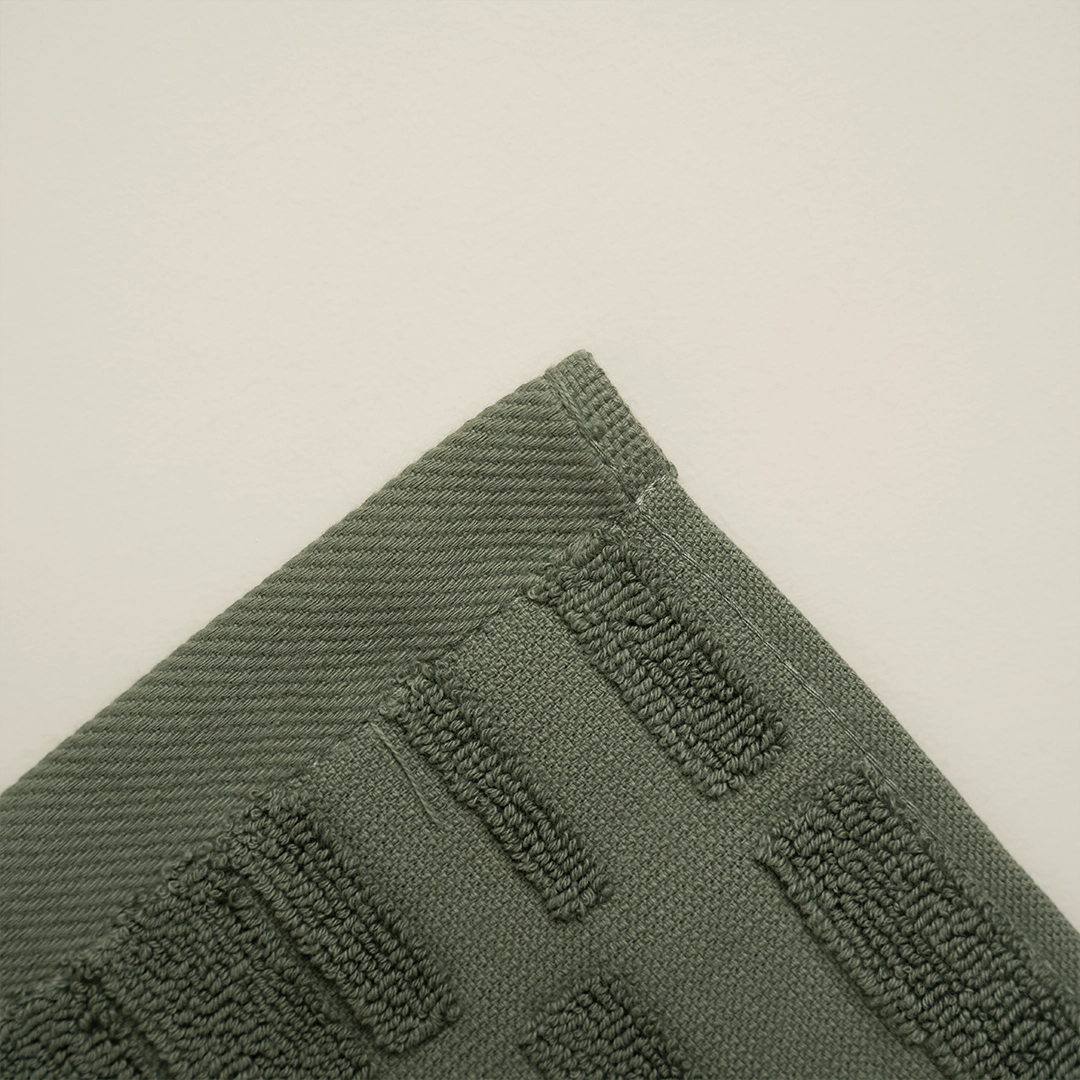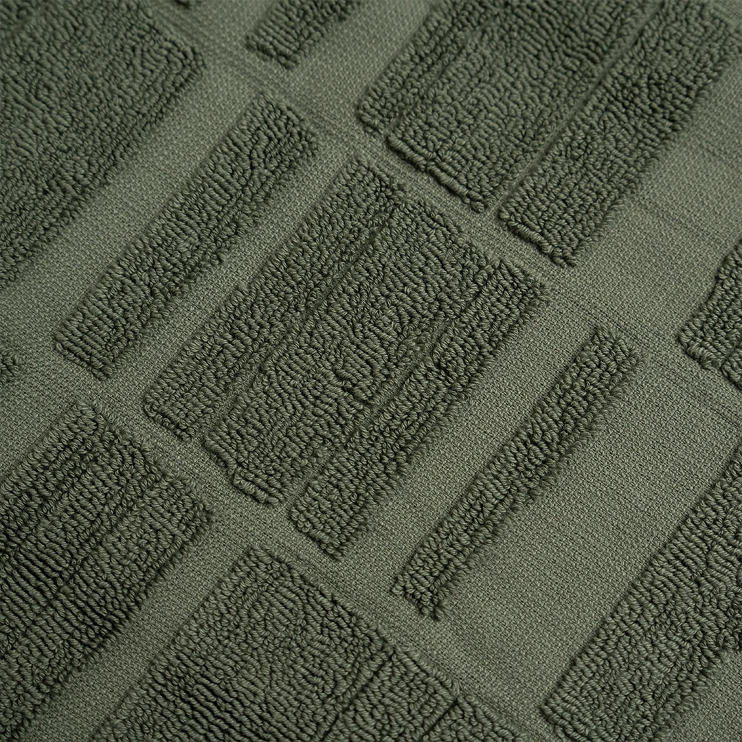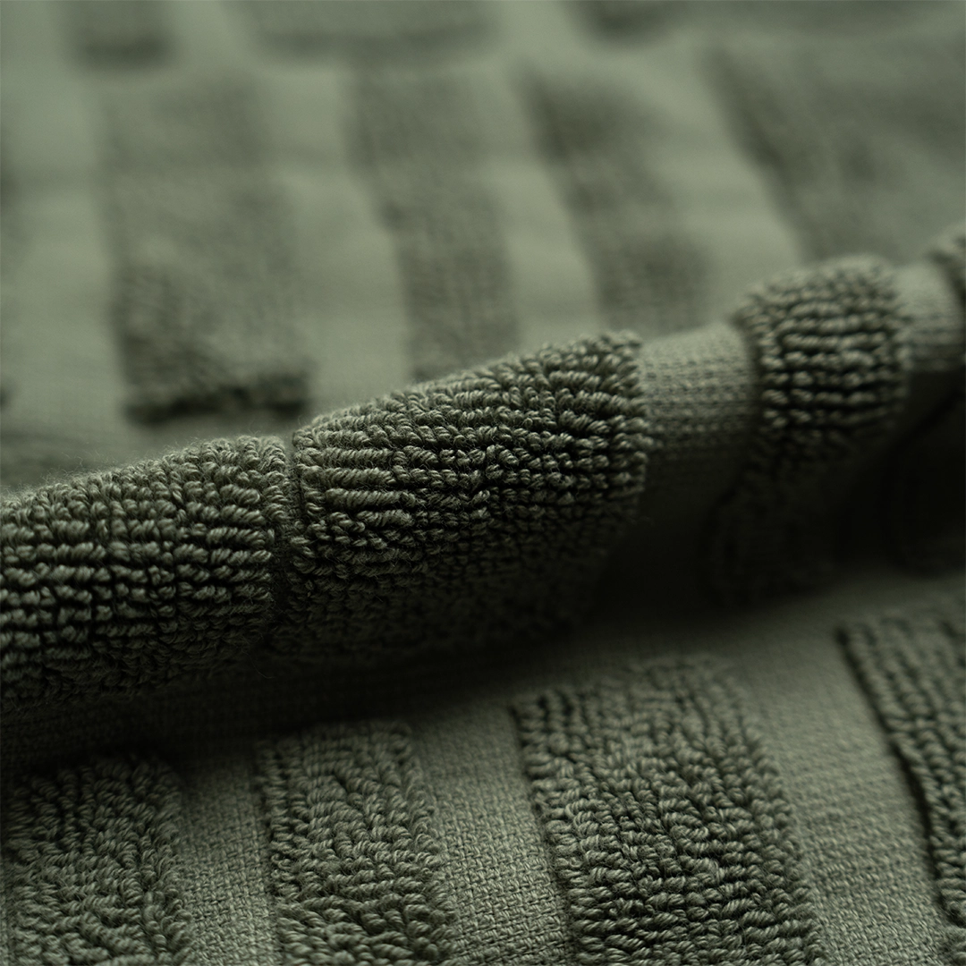 منشفة بتصميم جاكار فاخر يمنحها عمقاً بصرياً فريداً دون الحاجة للتطريز، النسيج نفسه هو قطعة فنية.