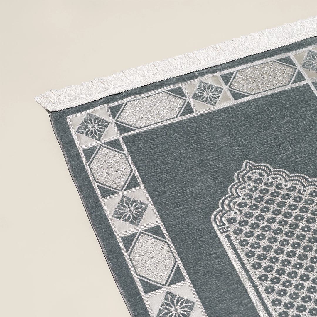 تتميز سجادة الصلاة هذه بـاللون الأخضر الهادئ، وهي مصنوعة بالكامل من قماش الشنيل الفاخر الذي يمنحها ملمساً مخملياً ناعماً جداً لزيادة الاسترخاء. توفر السجادة سطحاً مريحاً، وهي متينة وتحافظ على جودتها. تأتي بمقاس 70×118 سم  العملي والمناسب للاستخدام اليومي، وهي صنع في السعودية.